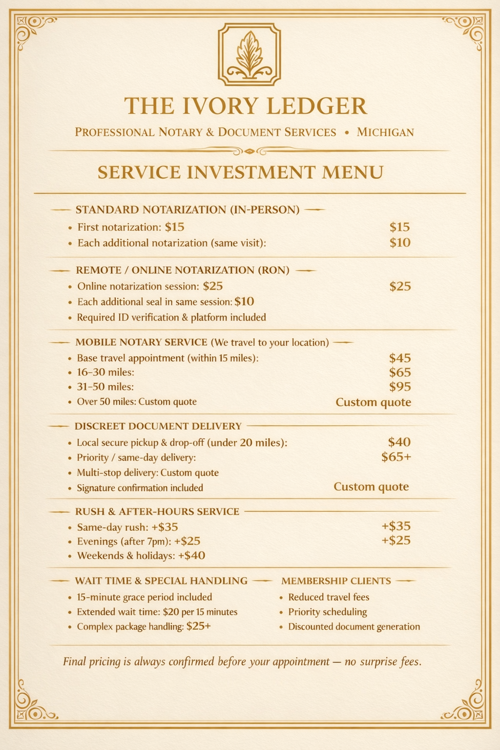 At The Ivory Ledger, our Service Investment Menu is designed to be clear, fair, and transparent so you always know what to expect before you book. We provide straightforward pricing for in-person, mobile, remote, and online notarizations, as well as discreet document delivery and business document support. Rates are structured by service type, travel distance, and timing, with optional rush and after-hours upgrades available. Every appointment is confirmed with final pricing in advance — no hidden fees, no surprises — just professional, dependable service you can plan around with confidence.